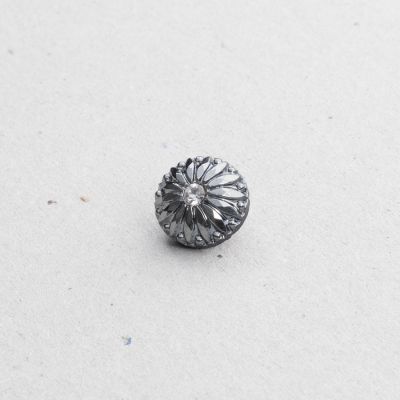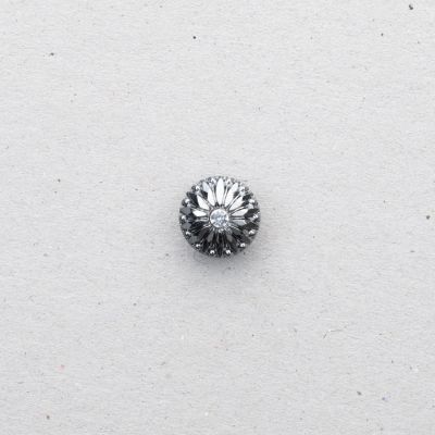Der runde Knopf hat in der Mitte einen Chatonstein, der von schmalen Blütenblättern die eines Gänseblümchens umgeben ist.